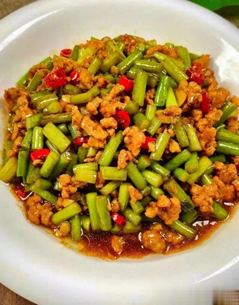 蒜苔丁炒肉碎准备食材: 瘦肉、蒜苔、姜蒜末、小米辣。