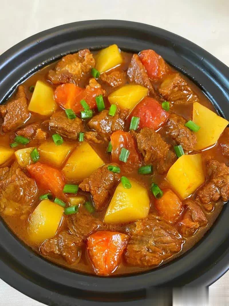 6. 放入土豆块和胡萝卜块,继续炖 20 分钟左右,至食材软烂,加入适量盐调味,大火收汁即可。