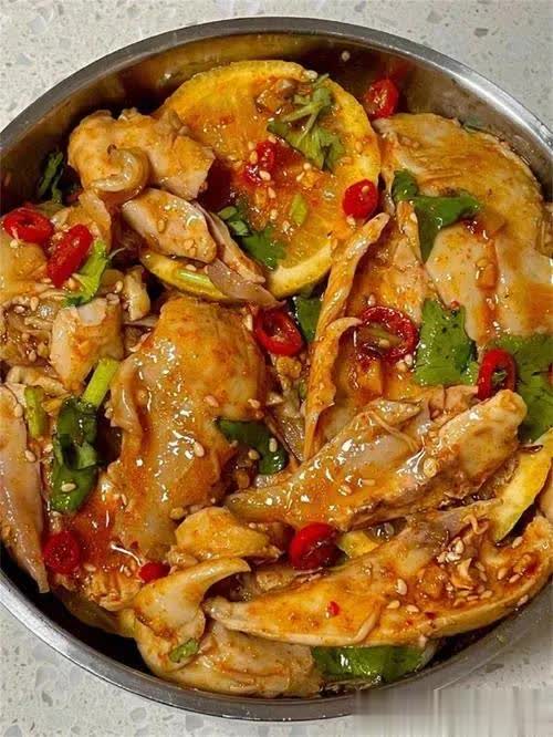 5、调味:两勺鸡精,一勺味精,一勺白胡椒粉,两勺花椒粉,三勺白糖,适量香醋,适量生抽,少许老抽,一勺香油,一勺花椒油一勺辣椒油,油酥花生米,蒜末,大小葱段,香菜搅拌均匀
